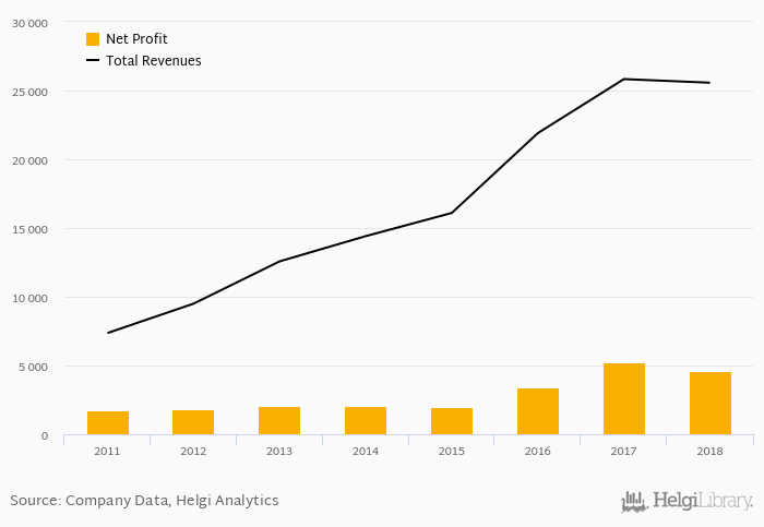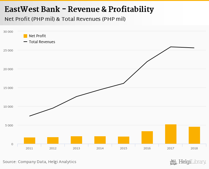 EastWest Bank made a net profit of PHP 4,622 mil under revenues of PHP 25,571 mil in 2018, up -11.6% and -1.02% respectively compared to the previous year.