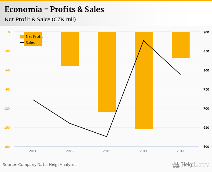 Economia made a net profit of CZK -40.5 mil in 2015, up 73.5% compared to the previous year. Total sales reached CZK 788 mil, which is down 10.2% when compared to the previous year.