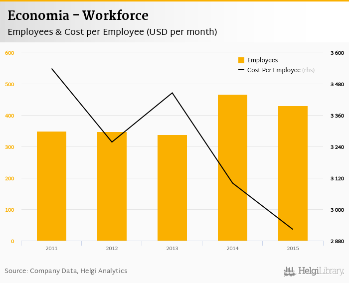 Economia employed 431 employees in 2015, down 7.55% compared to the previous year. Historically, between 2011 and 2015, the firm's workforce hit a high of 466 employees in 2014 and a low of 338 employees in 2013.