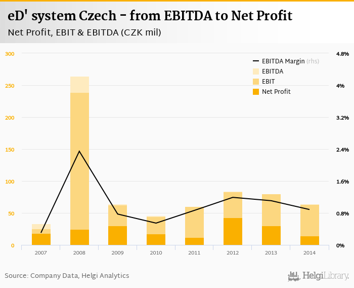 eD' system Czech made a net profit of CZK 14.3 mil with revenues of CZK 7,241 mil in 2014, down by 53% and down by 0.055%, respectively, compared to the previous year. This translates into a net margin of 0.197%.