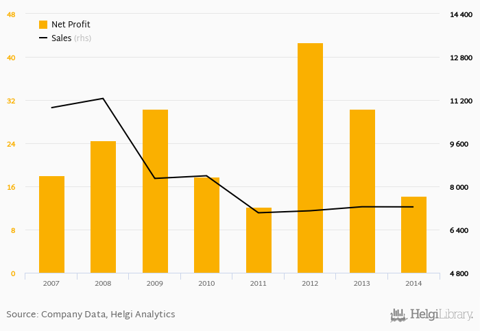 Sales have fallen by 2.68% a year on average since 2009. They reached a high of CZK 11,260 mil in 2008 and a low of CZK 7,022 mil in 2011.