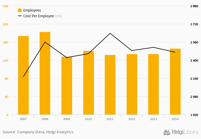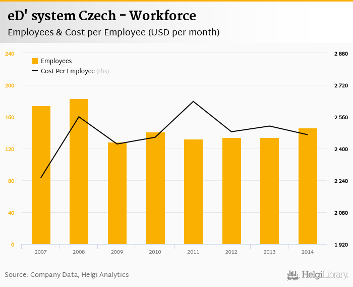 eD' system Czech employed 146 employees in 2014, up 8.96% compared to the previous year. Historically, between 2007 and 2014, the firm's workforce hit a high of 183 employees in 2008 and a low of 128 employees in 2009.