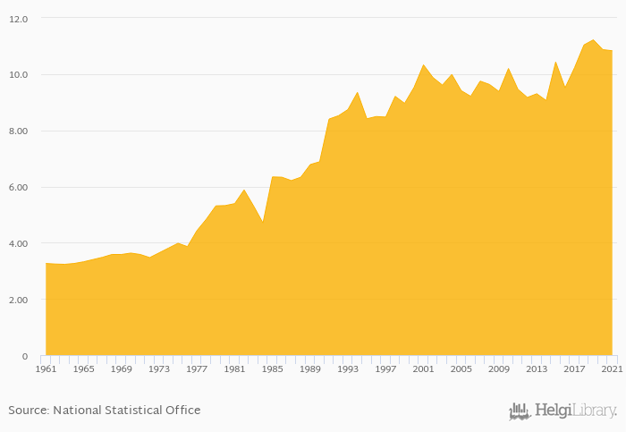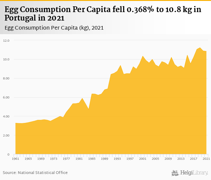 Egg consumption per capita fell 0.368% to 10.8 kg in Portugal in 2021, according to Faostat.