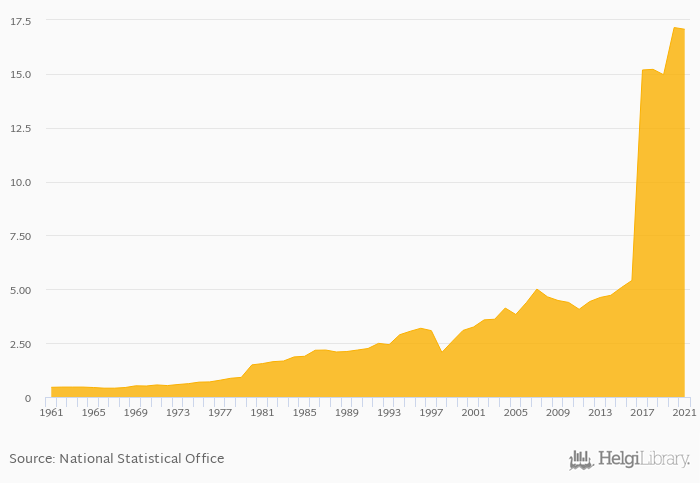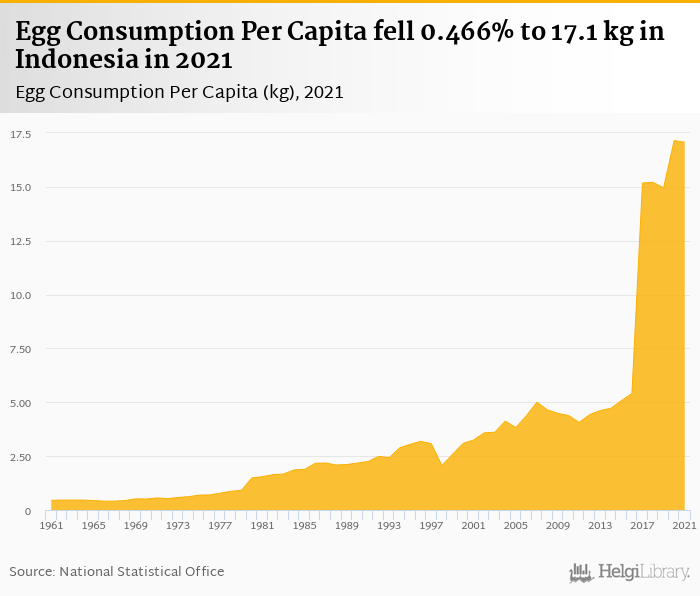 Egg consumption per capita fell 0.466% to 17.1 kg in Indonesia in 2021, according to Faostat.
