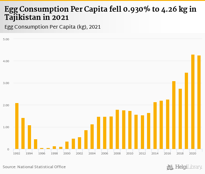 Egg consumption per capita fell 0.930% to 4.26 kg in Tajikistan in 2021, according to Faostat.