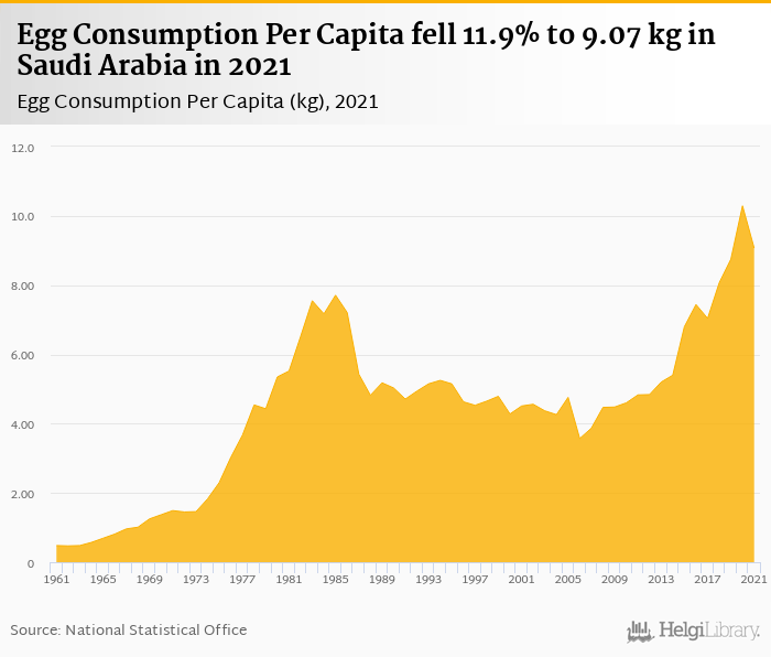 Egg consumption per capita fell 11.9% to 9.07 kg in Saudi Arabia in 2021, according to Faostat.