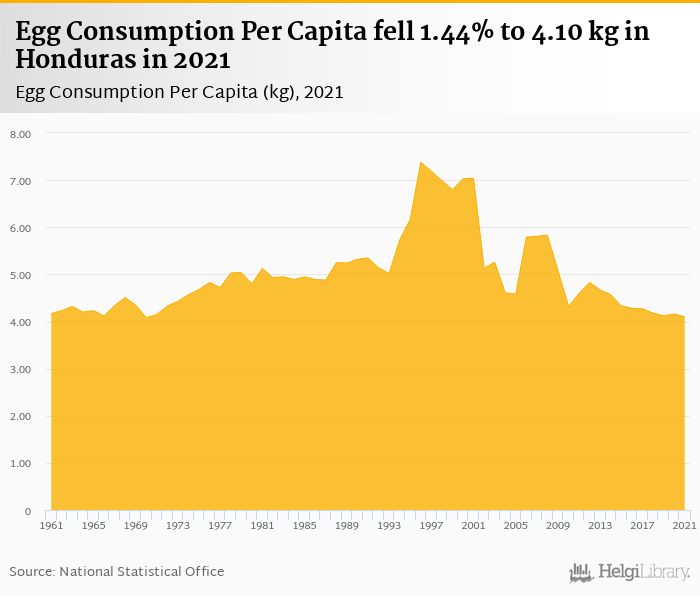 Egg consumption per capita fell 1.44% to 4.10 kg in Honduras in 2021, according to Faostat.