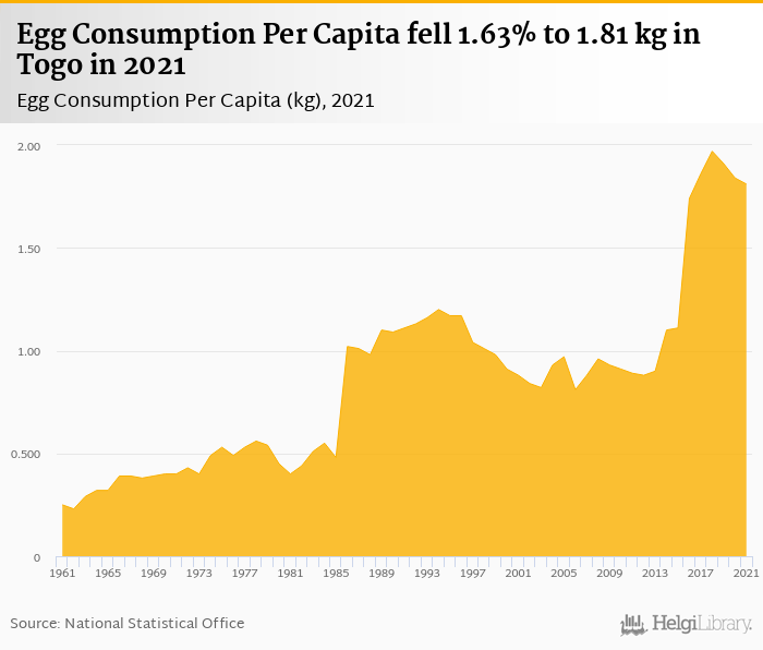 Egg consumption per capita fell 1.63% to 1.81 kg in Togo in 2021, according to Faostat.