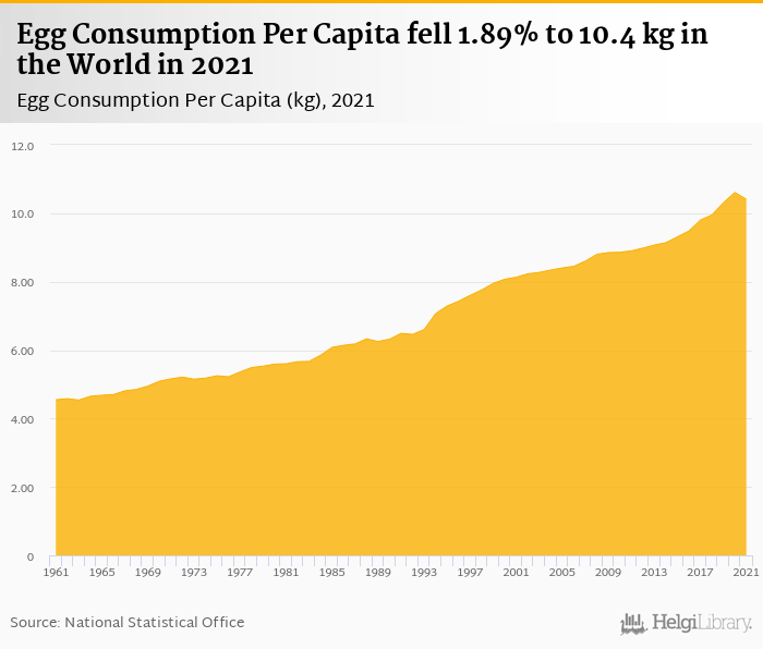 Egg consumption per capita fell 1.89% to 10.4 kg in the World in 2021, according to Faostat.