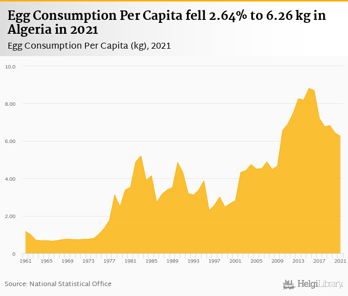 Egg consumption per capita fell 2.64% to 6.26 kg in Algeria in 2021, according to Faostat.