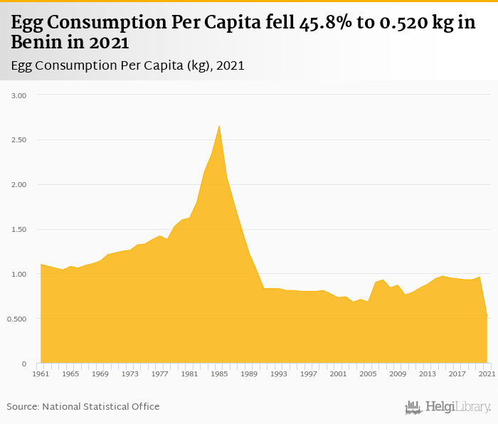 Egg consumption per capita fell 45.8% to 0.520 kg in Benin in 2021, according to Faostat.