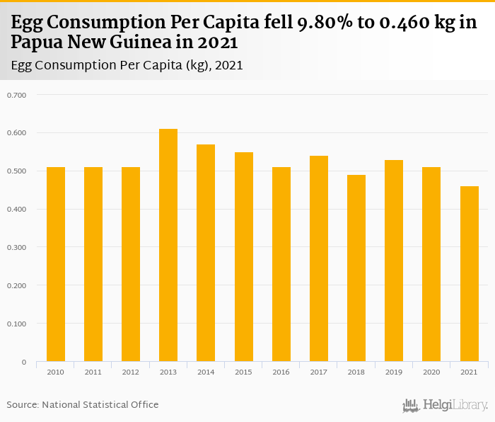 Egg consumption per capita fell 9.80% to 0.460 kg in Papua New Guinea in 2021, according to Faostat.
