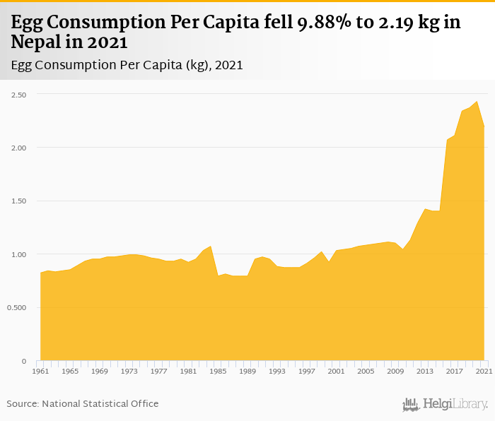 Egg consumption per capita fell 9.88% to 2.19 kg in Nepal in 2021, according to Faostat.