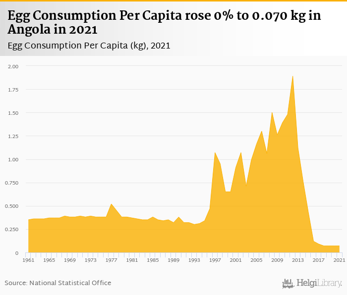 Egg consumption per capita rose 0% to 0.070 kg in Angola in 2021, according to Faostat.