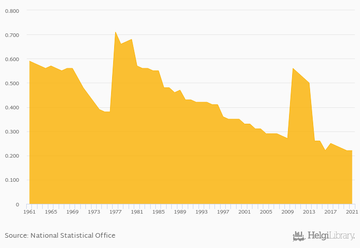 Historically, egg consumption per capita in Chad reached an all time high of 0.710 kg in 1977 and an all time low of 0.220 kg in 2021. When compared to Chad's main peers, egg consumption per capita in Cameroon amounted to 1.84 kg, 0.230 kg in Niger, 2.71 kg in Nigeria and 1.09 kg in Sudan in 2021.