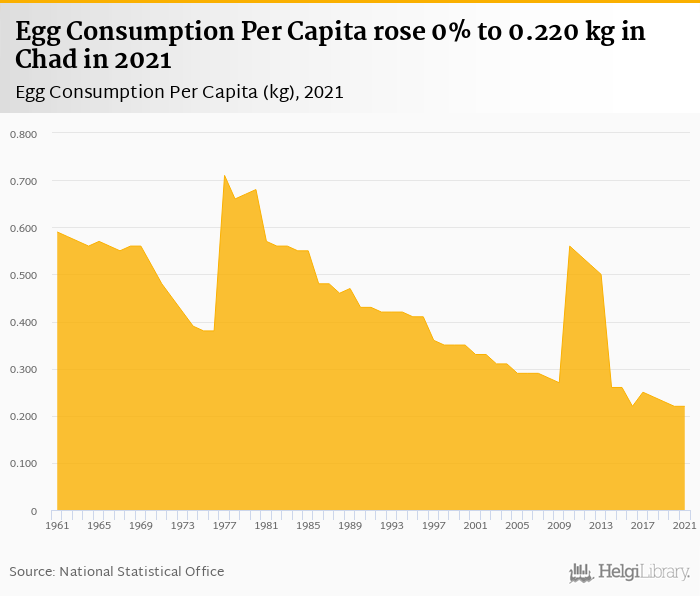 Egg consumption per capita rose 0% to 0.220 kg in Chad in 2021, according to Faostat.
