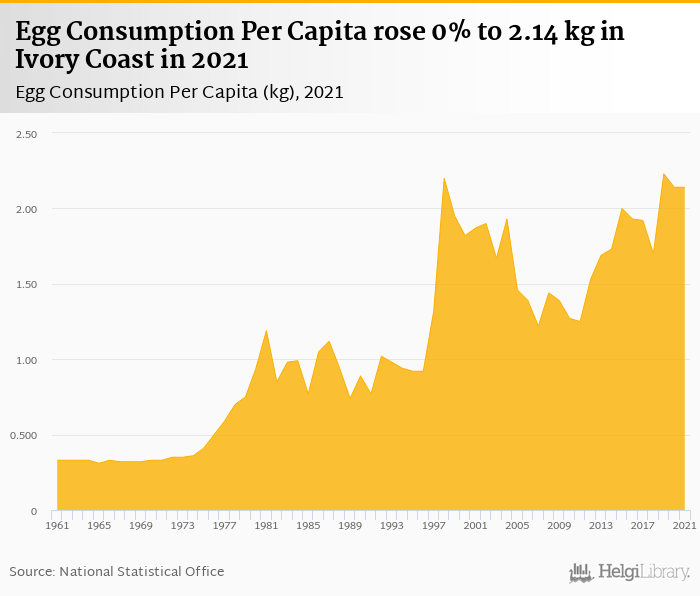 Egg consumption per capita rose 0% to 2.14 kg in Ivory Coast in 2021, according to Faostat.