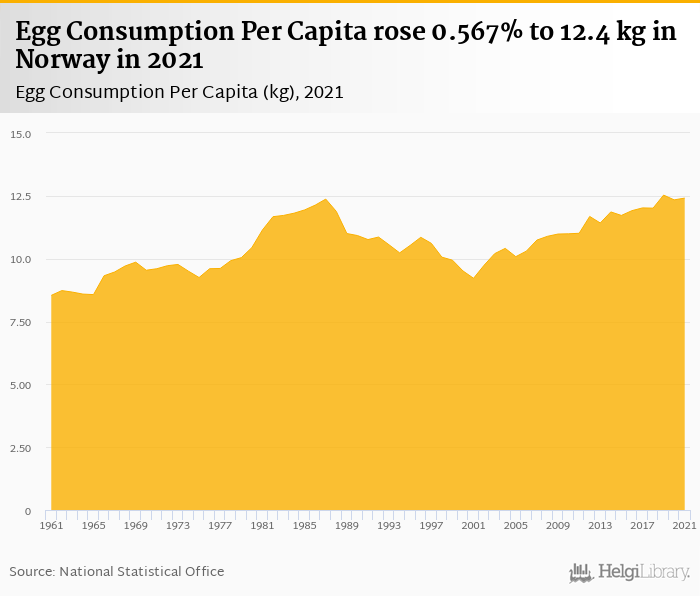 Egg consumption per capita rose 0.567% to 12.4 kg in Norway in 2021, according to Faostat.
