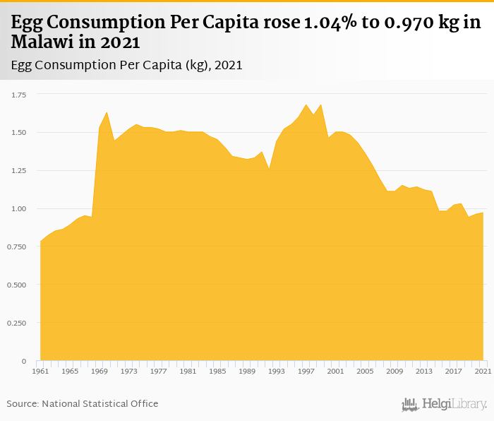 Egg consumption per capita rose 1.04% to 0.970 kg in Malawi in 2021, according to Faostat.