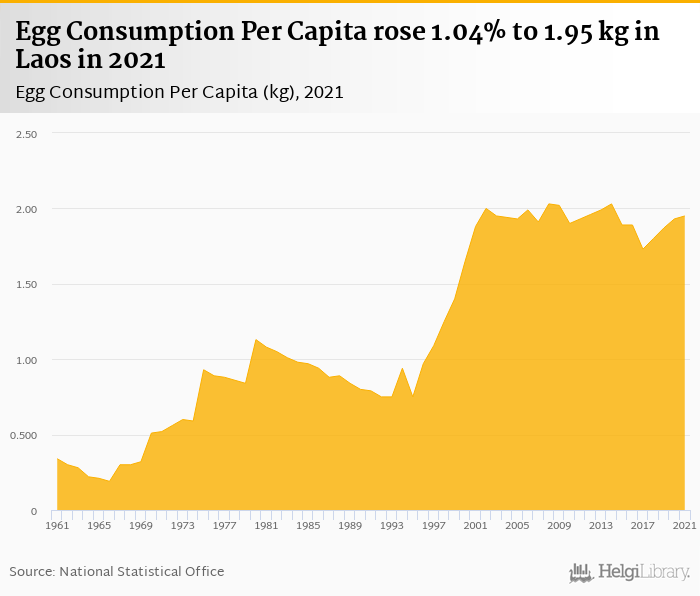 Egg consumption per capita rose 1.04% to 1.95 kg in Laos in 2021, according to Faostat.