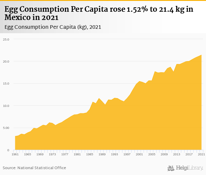 Egg consumption per capita rose 1.52% to 21.4 kg in Mexico in 2021, according to Faostat.