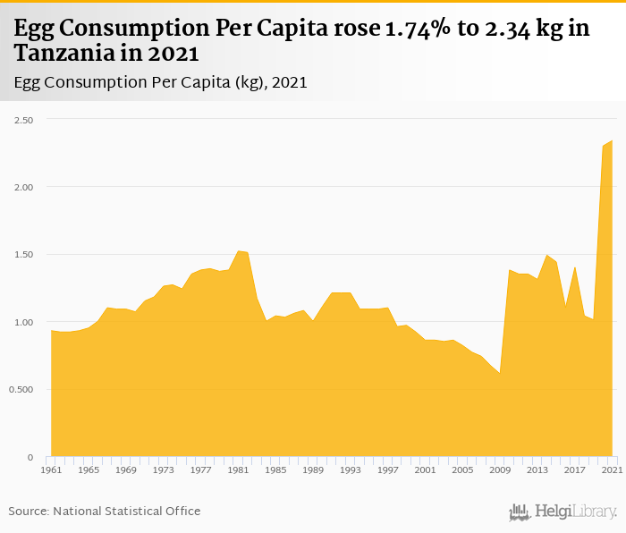 Egg consumption per capita rose 1.74% to 2.34 kg in Tanzania in 2021, according to Faostat.