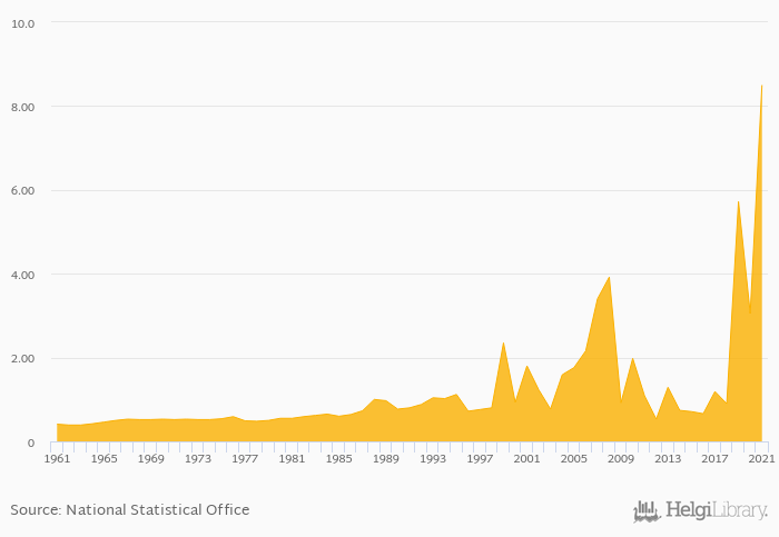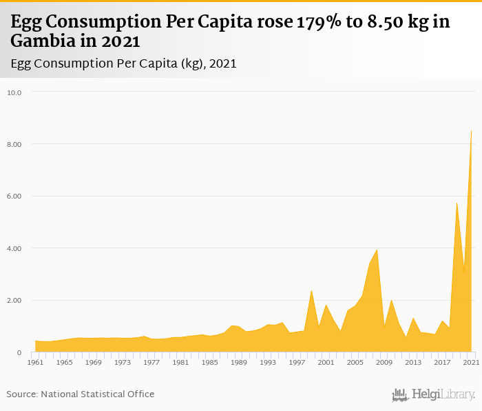 Egg consumption per capita rose 179% to 8.50 kg in Gambia in 2021, according to Faostat.
