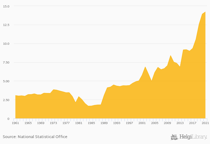 Egg consumption per capita rose 2.08% to 14.2 kg in Dominican Republic in 2021, according to Faostat.