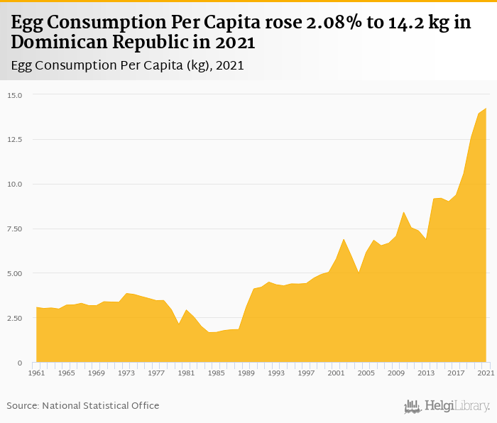 Egg consumption per capita rose 2.08% to 14.2 kg in Dominican Republic in 2021, according to Faostat.