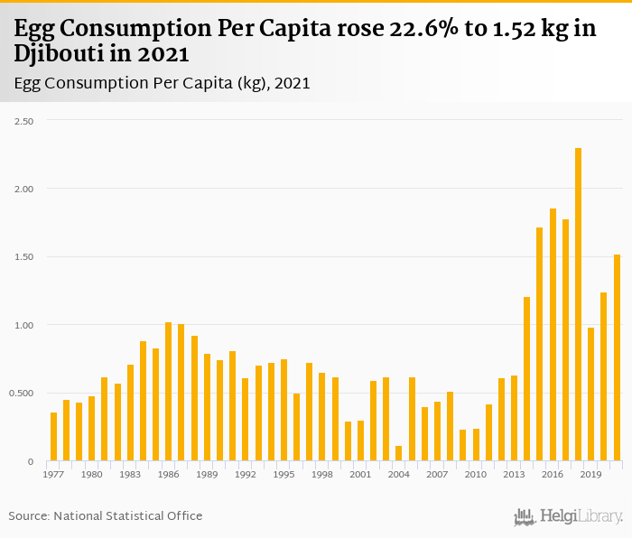 Egg consumption per capita rose 22.6% to 1.52 kg in Djibouti in 2021, according to Faostat.