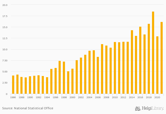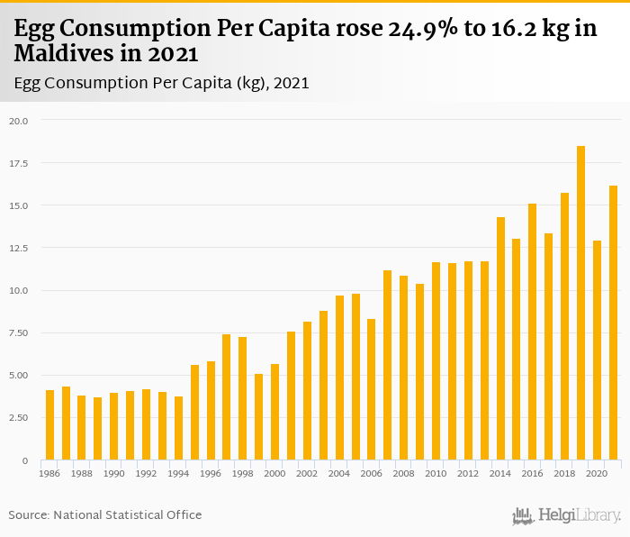 Egg consumption per capita rose 24.9% to 16.2 kg in Maldives in 2021, according to Faostat.