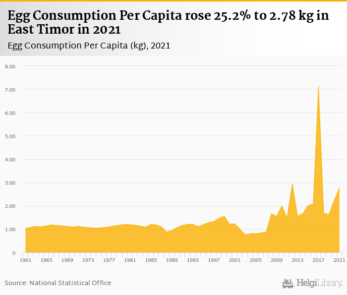 Egg consumption per capita rose 25.2% to 2.78 kg in East Timor in 2021, according to Faostat.