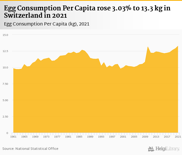 Egg consumption per capita rose 3.03% to 13.3 kg in Switzerland in 2021, according to Faostat.