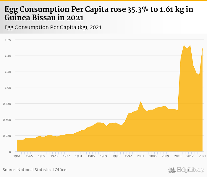 Egg consumption per capita rose 35.3% to 1.61 kg in Guinea Bissau in 2021, according to Faostat.
