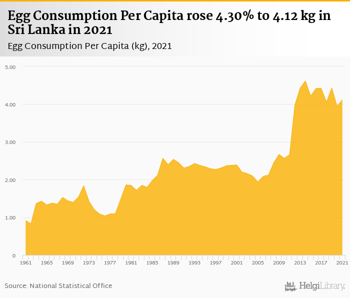 Egg consumption per capita rose 4.30% to 4.12 kg in Sri Lanka in 2021, according to Faostat.