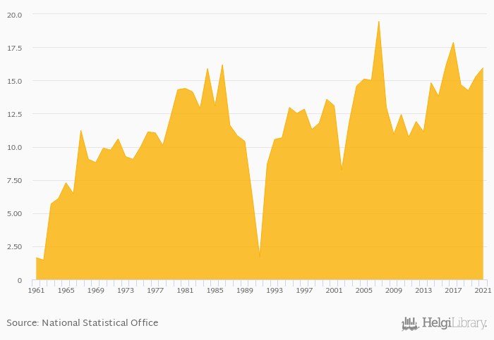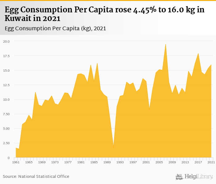 Egg consumption per capita rose 4.45% to 16.0 kg in Kuwait in 2021, according to Faostat.