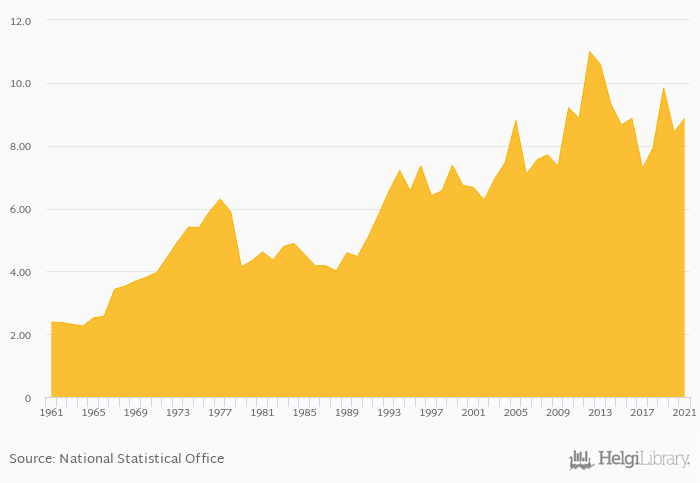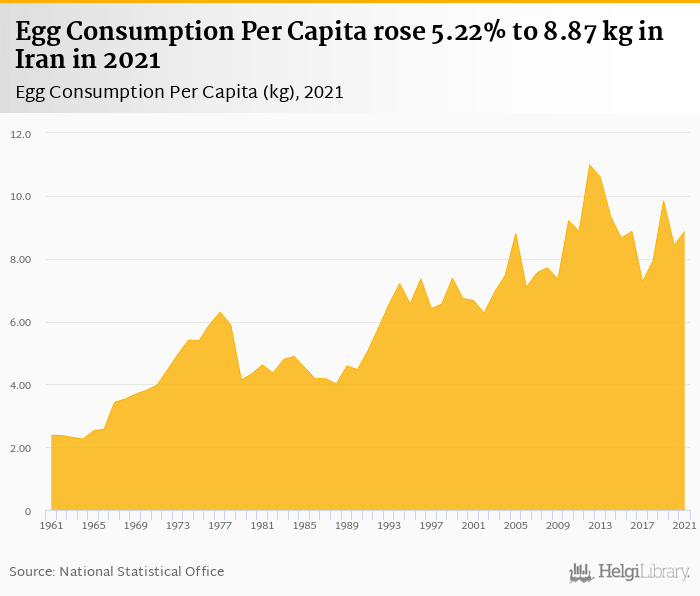 Egg consumption per capita rose 5.22% to 8.87 kg in Iran in 2021, according to Faostat.