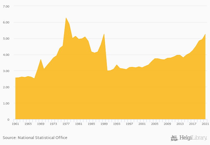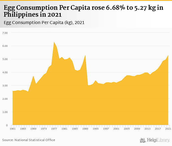 Egg consumption per capita rose 6.68% to 5.27 kg in Philippines in 2021, according to Faostat.