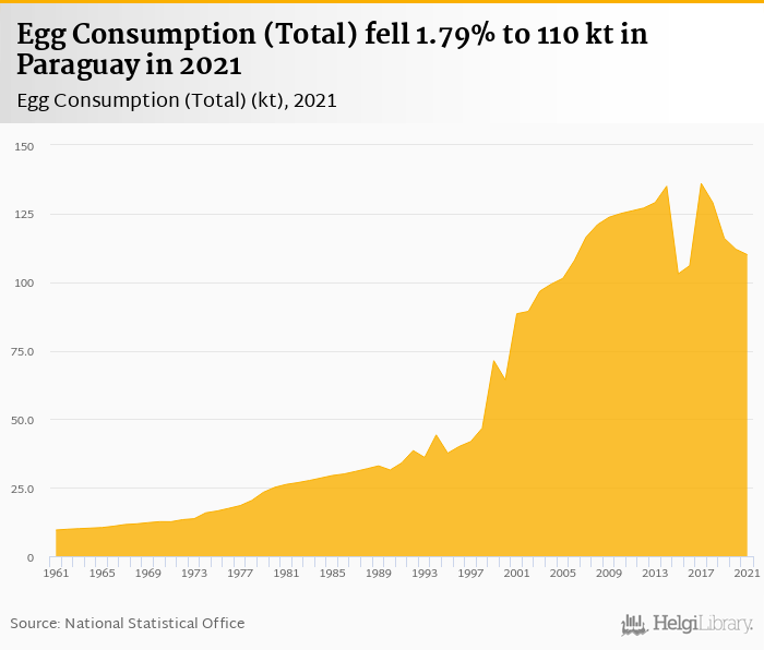 Total egg consumption fell 1.79% to 110 kt in Paraguay in 2021, according to Faostat.