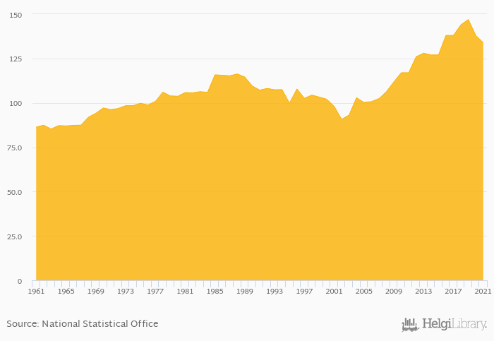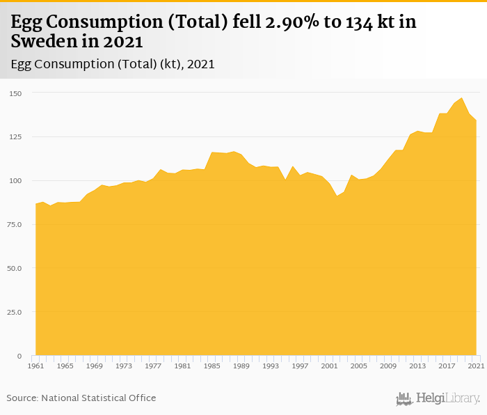 Total egg consumption fell 2.90% to 134 kt in Sweden in 2021, according to Faostat.