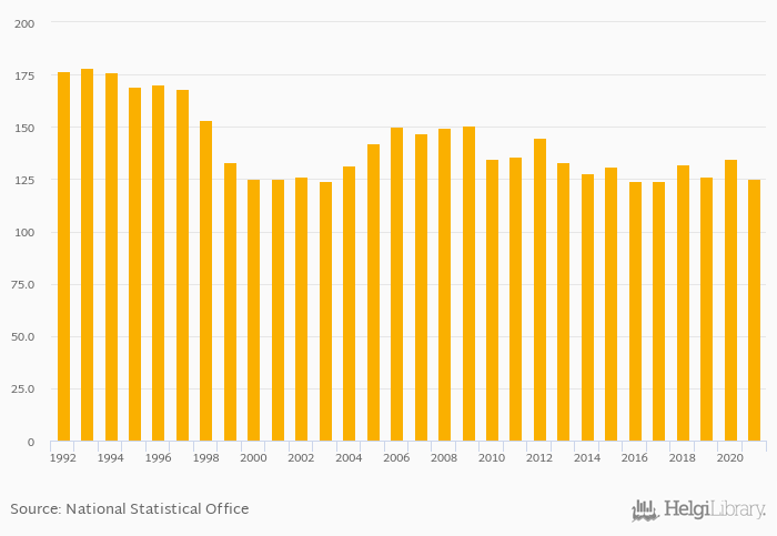 Historically, total egg consumption in Belarus reached an all time high of 178 kt in 1993 and an all time low of 124 kt in 2003. When compared to Belarus's main peers, total egg consumption in Lithuania amounted to 34.0 kt, 375 kt in Poland, 2,397 kt in Russia and 754 kt in Ukraine in 2021.
