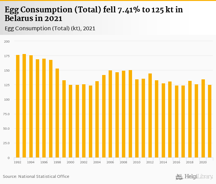 Total egg consumption fell 7.41% to 125 kt in Belarus in 2021, according to Faostat.