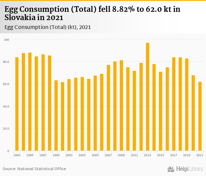 Total egg consumption fell 8.82% to 62.0 kt in Slovakia in 2021, according to Faostat.