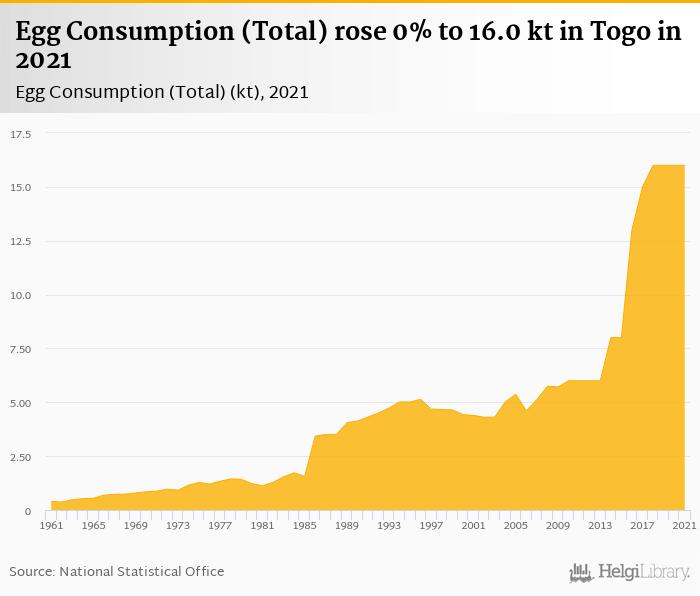 Total egg consumption rose 0% to 16.0 kt in Togo in 2021, according to Faostat.