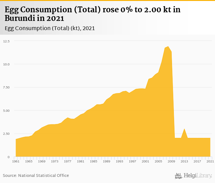 Total egg consumption rose 0% to 2.00 kt in Burundi in 2021, according to Faostat.