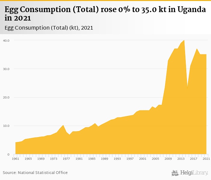 Total egg consumption rose 0% to 35.0 kt in Uganda in 2021, according to Faostat.