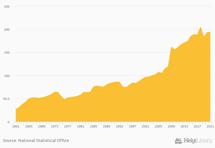 Historically, total egg consumption in Chile reached an all time high of 205 kt in 2018 and an all time low of 27.1 kt in 1961. When compared to Chile's main peers, total egg consumption in Argentina amounted to 762 kt, 86.0 kt in Bolivia, 110 kt in Paraguay and 47.0 kt in Uruguay in 2021.