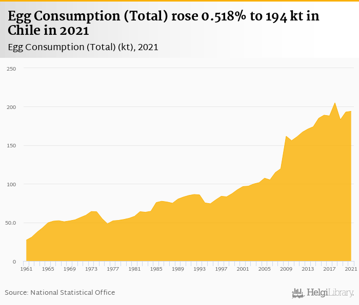 Total egg consumption rose 0.518% to 194 kt in Chile in 2021, according to Faostat.