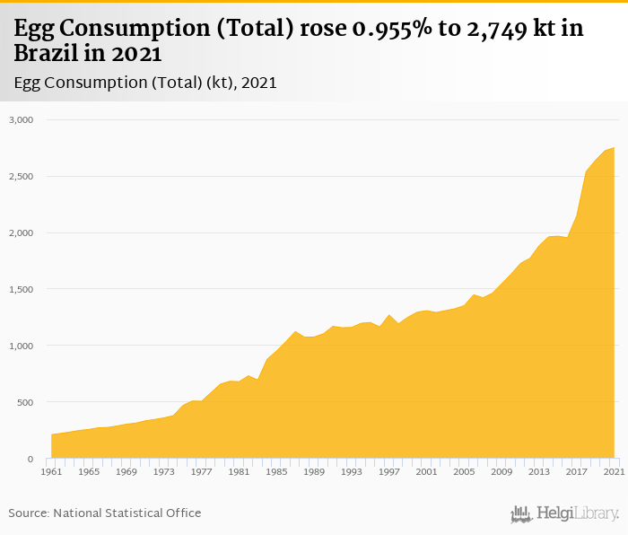 Total egg consumption rose 0.955% to 2,749 kt in Brazil in 2021, according to Faostat.