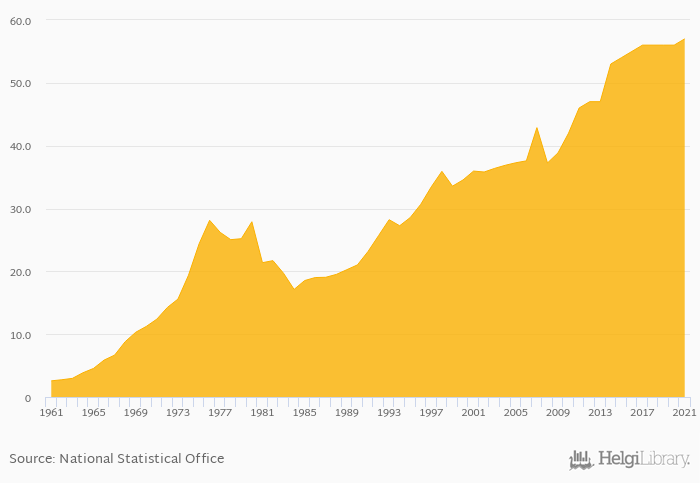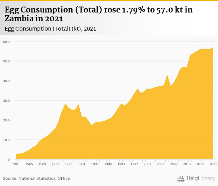 Total egg consumption rose 1.79% to 57.0 kt in Zambia in 2021, according to Faostat.